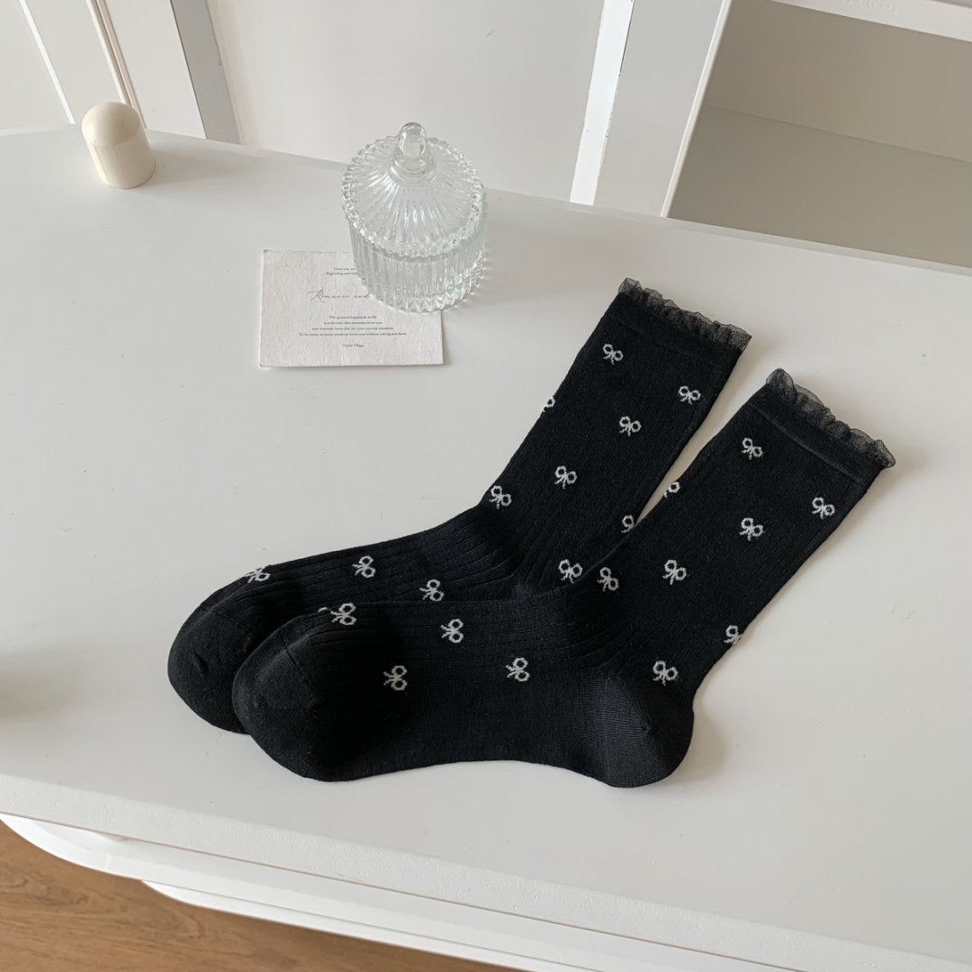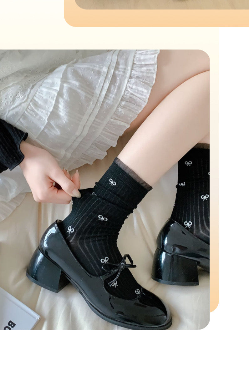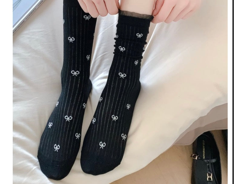Set of 3 Pairs Women Girls Teen Bow Ribbon Printed Mesh Top Soft Thin Comfy Breathable Ankle Socks
